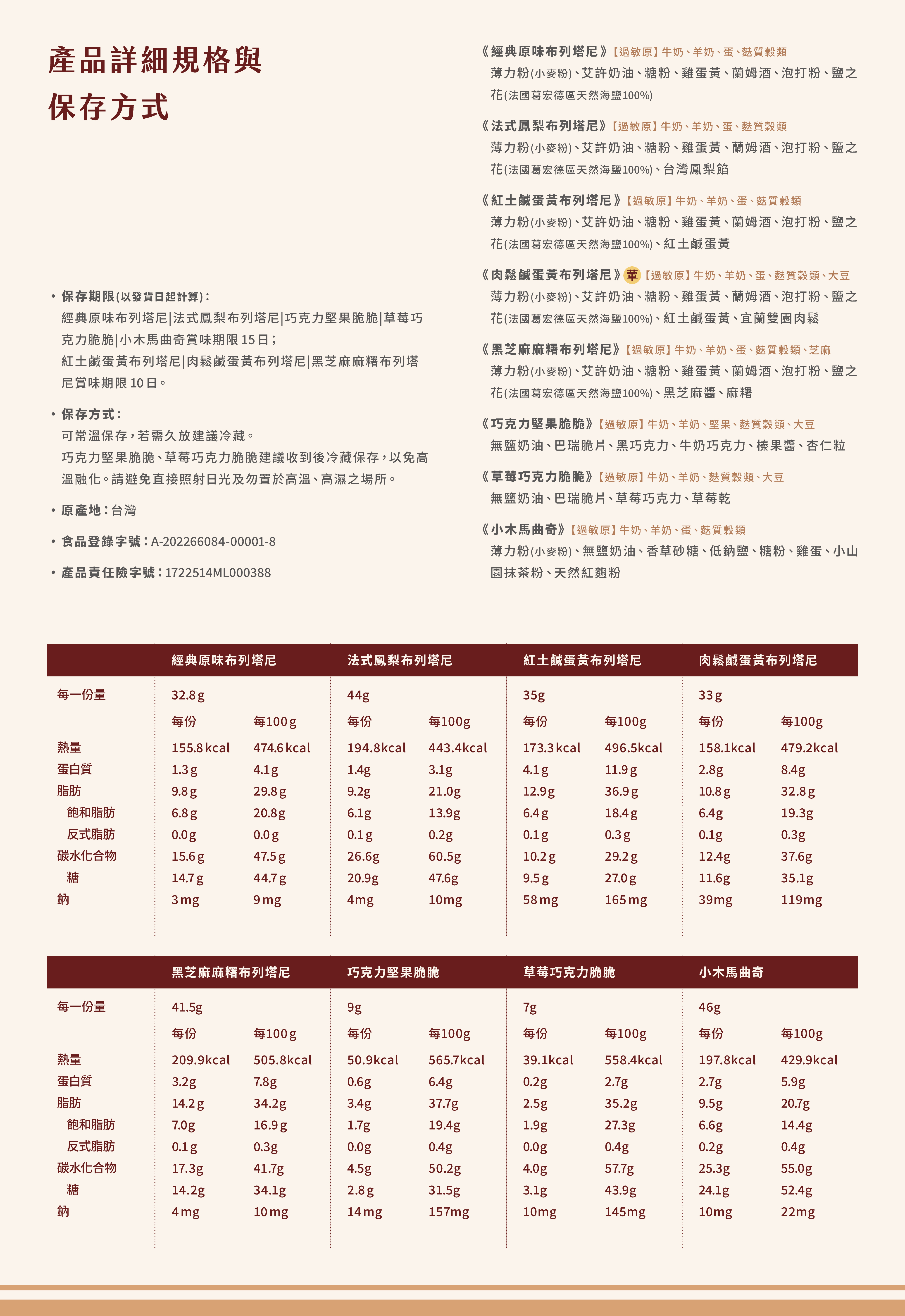 ・ 保存方式:以發貨日起計算,經典原味布列塔尼賞味期限15日,其餘商品賞味期限為10日。可常溫保存,包裝拆封後,請立即食用完畢或放置冰箱冷藏,以保新鮮