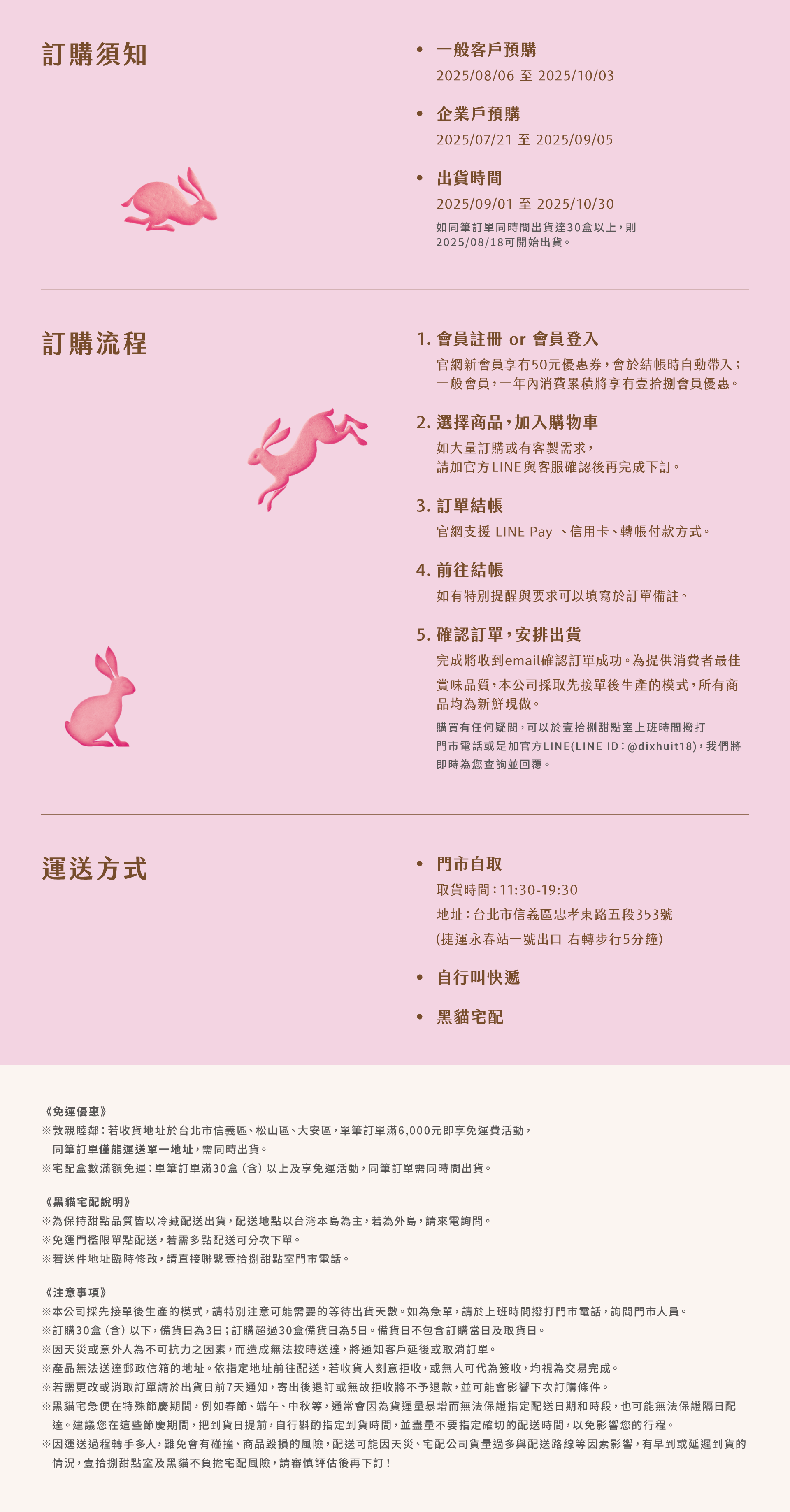 ・ 為保持甜點品質皆以冷藏配送出貨,收到後可常溫保存/送禮。